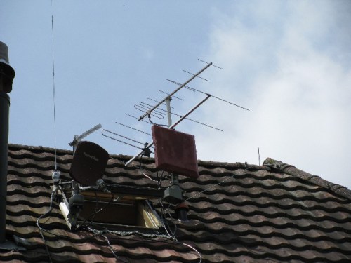 Bild: Von links nach rechts: Eigenbau 6m λ/2 Vertikalstrahler für 6m, Technisat DigiDish 33 mit Hornfeed für 10 GHz, darüber eine kurze Scheibenyagi für 13cm. Rechts oben eine Eigenbau-Yagi für 70cm nach DL6WU, darunter eine kurze Yagi für 2m eines Anbieters vom Flohmarkt Friedrichshafen, dessen Name ich vergessen habe und dann die beschriebene WIMO-Flachantenne für 23cm. Fehlt eigentlich nur 5.7 GHz. Aber was nicht ist, kann ja noch werden. Beide Rotoren sind übrigens Low Cost TV Ausführungen.