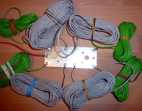 Ich werde die Drähte einfach auf den sandigen Boden legen und hoffen, dass niemand darüber stolpert. So ein Erdnetz braucht übrigens nicht abgestimmt zu sein. Der Aufwand, die einzelnen Drähte abzugleichen, wäre auch viel zu hoch. Ganz anders bei einem hoch über der Erde montierten Monopol. Dort müssen die Radiale auf Resonanz getrimmt werden, sofern man auf ein passables SWR Wert legt. Zudem sollten sie in einem 45° Winkel nach unten geführt werden. Dafür reichen zwei Stück um annähernd Rundumstrahlung zu erzielen. Drei sind Luxus.