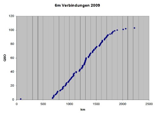 Obiges Bild zeigt eine Analyse meiner Es-Verbindungen auf dem 6m Band im Jahre 2009. Es sind 103 QSO’s. Eigentlich habe ich 106 QSO’s gemacht. Aber die Langstreckenverbindungen in die Karibik und USA habe ich ausgeklammert. Auch Lokalverbindungen habe ich nicht berücksichtigt. Gearbeitet wurde mit 100W an einer Vertikalantenne sowohl in SSB wie auch in CW. Auf der X-Achse sind die überbrückten Distanzen eingetragen, auf der Y-Achse die QSO’s.